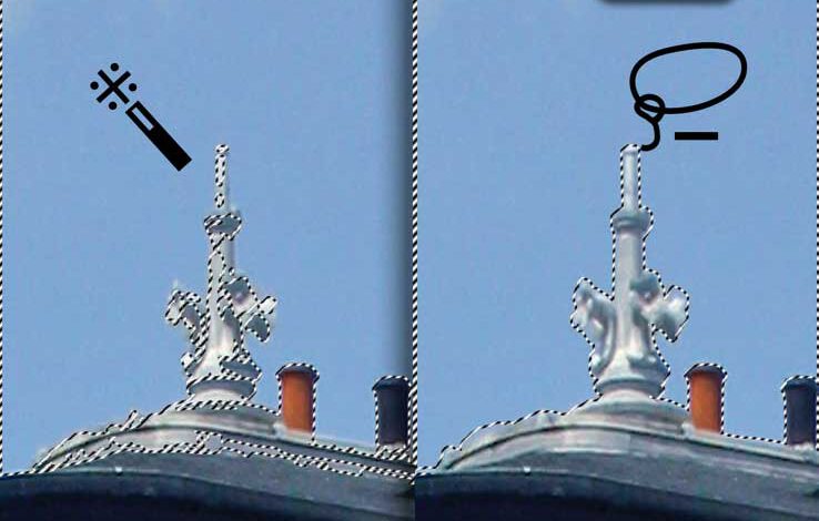Nach dem Überblick der Kombinationsmöglichkeiten, die Photoshop für seine Auswahlen bietet, möchte ich Ihnen an ein paar Beispielen den praktischen Einsatz demonstrieren: Bei diesem Bild habe ich für den Zauberstab eine relativ hohe Toleranz gewählt, um alle vorkommenden Blautöne und einen Teil der diffusen Wolken zu selektieren. Dabei wurden allerdingsMehr