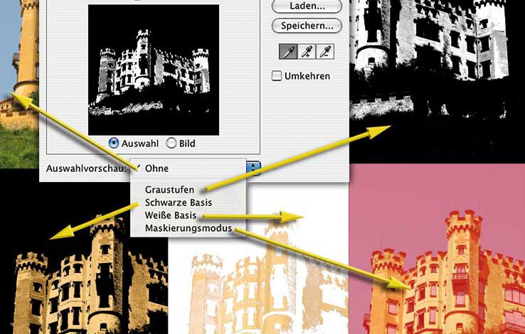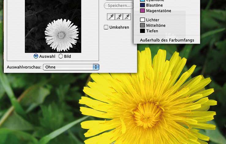 Die Kombination der Ansichten im Vorschau-Fenster des Einstellungsfeldes und der Vorschau des Bildes selbst erlauben eine sehr genaue Abschätzung des Auswahlergebnisses bereits vor seiner Anwendung. In der Regel ist es am sinnvollsten, das Bild selbst in der Originalansicht zu belassen und die Darstellung im Vorschau-Fenster auf „Auswahl“ zu setzen. DabeiMehr