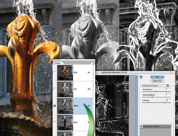 Ein Hauptproblem beim Schärfen ist die Ausbreitung des Effekts auf Bildbereiche, die man vor diesem Einfluss gern schützen würde. Wenn die Filter sich nicht darauf beschränken, Konturen hervorzuheben und Flächen unberücksichtigt zu lassen, müssen Sie sie dazu zwingen. Dazu brauchen Sie eine Auswahl, die nur Konturen freigibt und den RestMehr