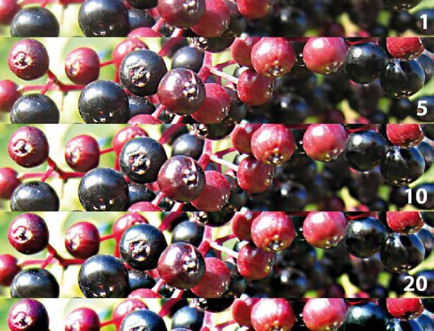 Bei diesen fünf Beispielen blieben die Werte von „Stärke“ (100) und „Schwellenwert“ (5) unverändert, während der „Radius“ Regler von oben nach unten nacheinander auf 1, 5, 10, 20 und das Maximum von 250 Pixel gesetzt wurde. „Radius“ bestimmt, wie weit der beeinflusste Bereich um jedes einzelne Pixel ausgedehnt wird. BereitsMehr