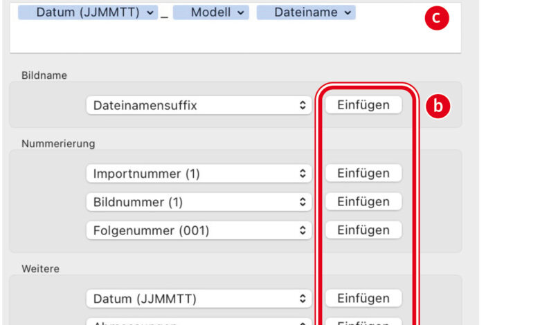 Im Importdialog können Sie durch Aktivierung der Checkbox »Dateien umbenennen« Ihren Fotos neue Dateinamen nach selbst gewählten Kriterien zuweisen. Das Ziel dieser Umbenennung ist es, sicherzustellen, dass alle Ihre Fotos einen eindeutigen Dateinamen erhalten. Am sichersten geschieht das, indem Sie vor den durch die Kamera vergebenen Dateinamen das numerische DatumMehr