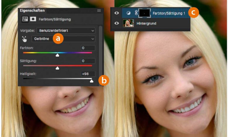 Eine leichte Gelbfärbung der Zähne ist völlig natürlich. Möchten Sie das Gelb reduzieren, ist die schlechteste Variante, die Zähne einfach zu entsättigen. Für ein natürliches Zahnweiß legen Sie eine Einstellungsebene »Farbton/Sättigung« an. Wechseln Sie in den Bereich der »Gelbtöne« (a) und erhöhen Sie hier den Wert für die »Helligkeit« (b).Mehr