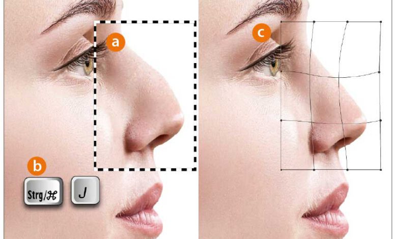 Mit »Bearbeiten > Transformieren > Verformen« können Sie eine Nasenkontur unkompliziert ändern. Wählen Sie dazu die Nase grob mit dem »Auswahlrechteck-Werkzeug« aus (a) und kopieren Sie den Bereich mit »Strg/Cmd-J« (b) auf eine neue Ebene. Rufen Sie »Verformen« auf und schieben Sie über die inneren Gitterlinien die Nasenkontur in PositionMehr