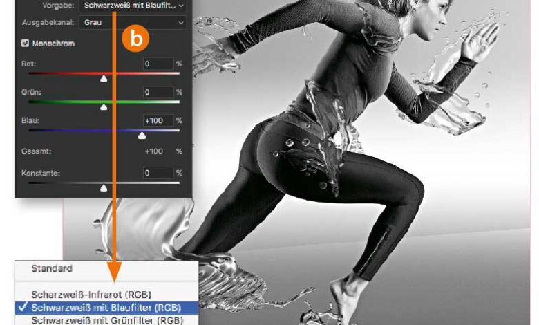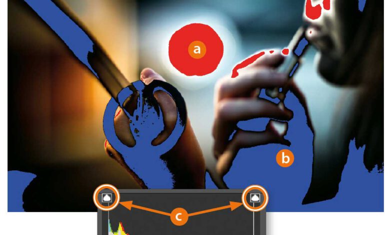 In Camera Raw lässt sich eine permanente Beschneidungswarnung einblenden, die Bereiche ohne verbleibende Details mit einer Farbüberlagerung hervorhebt. Rein weiße Bereiche werden durch eine rote (a), rein schwarze durch eine blaue (b) Überlagerung im Bild gekennzeichnet. Klicken Sie im Histogramm auf die Dreieckssymbole in den oberen Ecken, um diese VorschauMehr