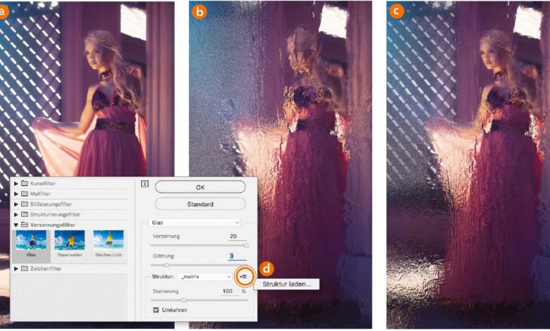 Mit dem »Versetzen«-Filter lassen sich interessante Effekte erzeugen. Jedoch bietet er weder eine direkte Sichtkontrolle, noch die Möglichkeit, die Verschieben-Matrix zu glätten. Für kleinere Verschiebungseffekte hat der Stilisierungsfilter »Glas«, den Sie in der »Filtergalerie« finden, genau diese Vorteile. Unter dem unscheinbaren »Struktur«-Menü (d) können Sie ein Bild im PSD-Format (e;Mehr