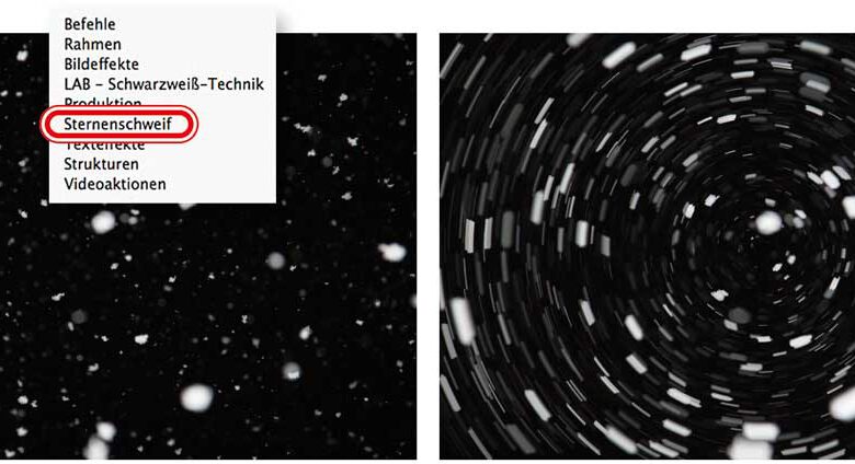 Oft suchen Photoshop-Anwender im Web nach passenden Pinseln, Formen, Mustern und dergleichen. Dabei sind im Lieferumfang von Photoshop schon eine ganze Reihe nützlicher Vorgaben vorhanden. Nur sind sie oft ein wenig versteckt. Mit der über das Menü des Aktionen-Fensters zu ladenden Aktion »Sternenschweif« lässt sich die Langezeitbelichtung eines Sternenhimmels simulieren.Mehr
