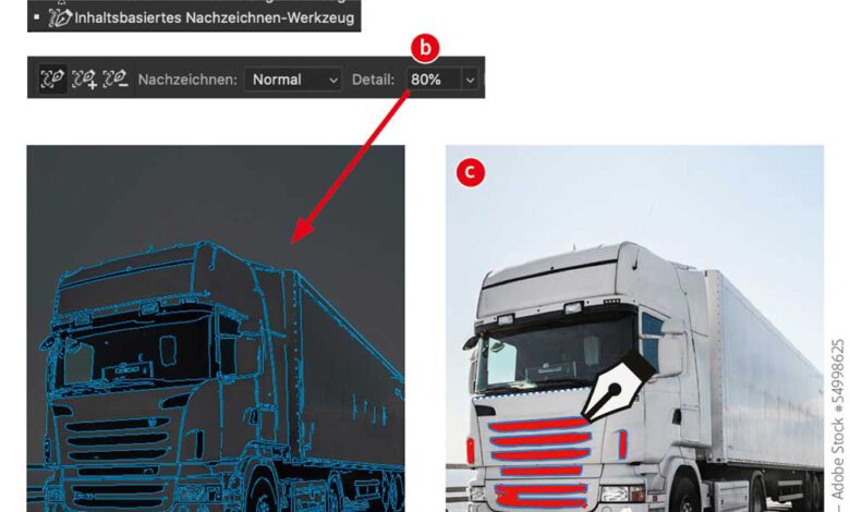 Dieses Werkzeug lässt sich in den Photoshop-Voreinstellungen unter »Technologievorschau« aktivieren (a). Sie finden es dann nach einem Neustart von Photoshop in der Werkzeugpalette. Über »Detail« (b) legen Sie den Kantenschwellenwert fest. Während Sie den Regler geklickt halten, erscheint eine Vorschau der erkannten Konturen im Bild. Anschließend können Sie dann imMehr