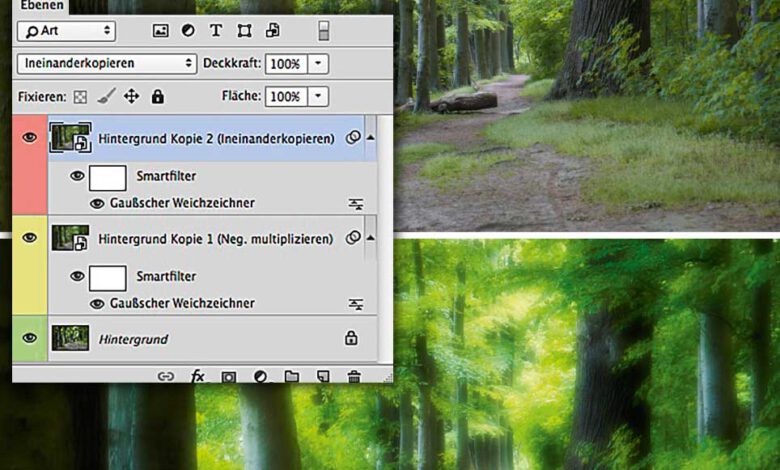 Für den verträumt und märchenhaft wirkenden Orton-Effekt (benannt nach dem Fotografen Michael Orton) wurden in der Analogfotografie zwei überbelichtete Bilder, von denen eins unscharf ist, zu einem normal belichteten Bild kombiniert. In Photoshop können Sie diesen Effekt leicht nachstellen und kreativ variieren. Duplizieren Sie zunächst die Hintergrundebene und verwandeln SieMehr