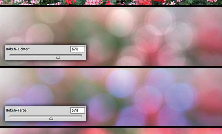 Über das »Weichzeichnungseffekte«-Panel in den Filtern der Weichzeichnergalerie lassen sich wunderschöne Zerstreuungskreise erzeugen. Soll das gesamte Bild weichgezeichnet werden, benutzen Sie am besten »Feld-Weichzeichnung«. Das weichgezeichnete Ergebnis können Sie dann als Hintergrund eines (Web-)Designs benutzen oder in einem Foto zum Beispiel mit »Negativ multiplizieren« überlagern und so ein unschönes BokehMehr