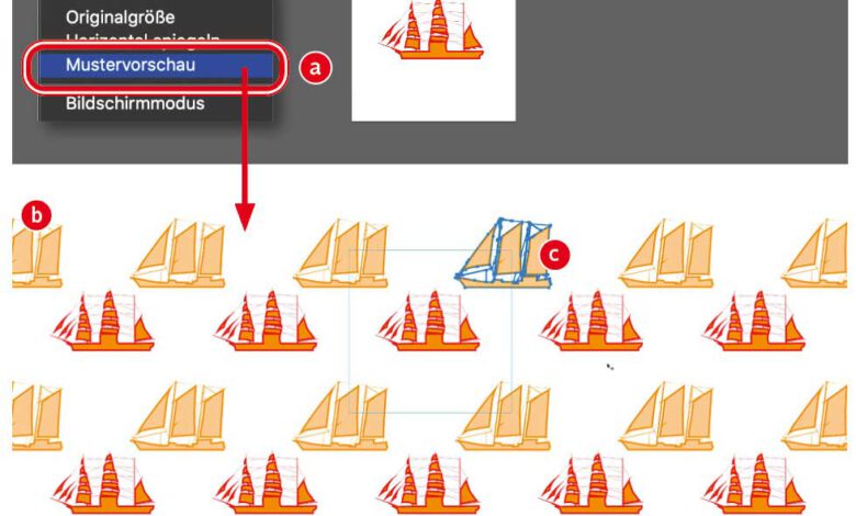 Nahtlose Muster zu erzeugen, brauchte es in älteren Photoshop-Versionen viel Tricksereien mit dem Filter »Verschiebungseffekt« und bei eher grafischen Mustern viel Erfahrung und wiederholtes Ausprobieren der erzeugten Muster. Das ist seit Photoshop 2021 einfacher. Aktivieren Sie »Ansicht > Mustervorschau«, wird das aktuelle Dokument (a) auf der Arbeitsfläche gekachelt dargestellt (b).Mehr