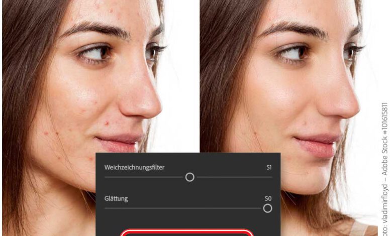 Photoshops Neural-Filter »Hautglättung« zeichnet Haut nicht einfach weich, sondern reduziert auch Pickel und andere Hautstörungen. Das Ergebnis (a) kann sich sehen lassen und die verbliebenen Störungen sind mit »Reparaturpinsel« und Co. schnell retuschiert. Erwarten Sie jedoch keine Highend-Beauty-Hautretusche. Für schnelle, gar nicht mal schlechte Ergebnisse ist dieser Filter aber gutMehr