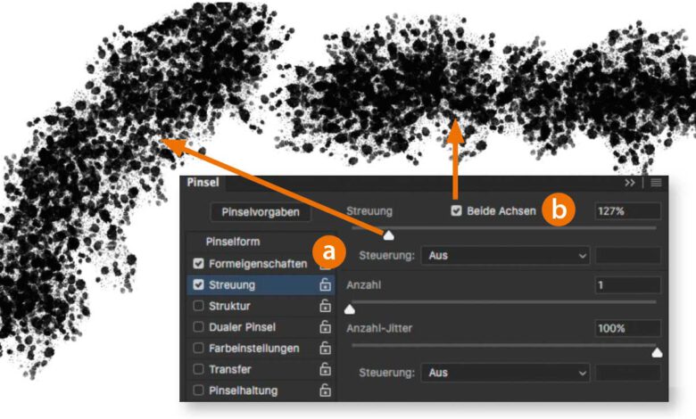 Beim Malen kann Ihnen eine zufällige Verteilung der einzelnen Pinselspitzen-Abdrücke viel Arbeit ersparen. Denn in einem einzigen Pinselstrich erzeugen Sie variierende Pinselabdrücke, für die Sie sonst viele Einzelklicks benötigen würden. Nutzen Sie dafür die Parameter in der »Pinsel«-Palette unter »Streuung«. Der dort zu findende, gleichbenannte Regler »Streuung« verteilt die PinselabdrückeMehr