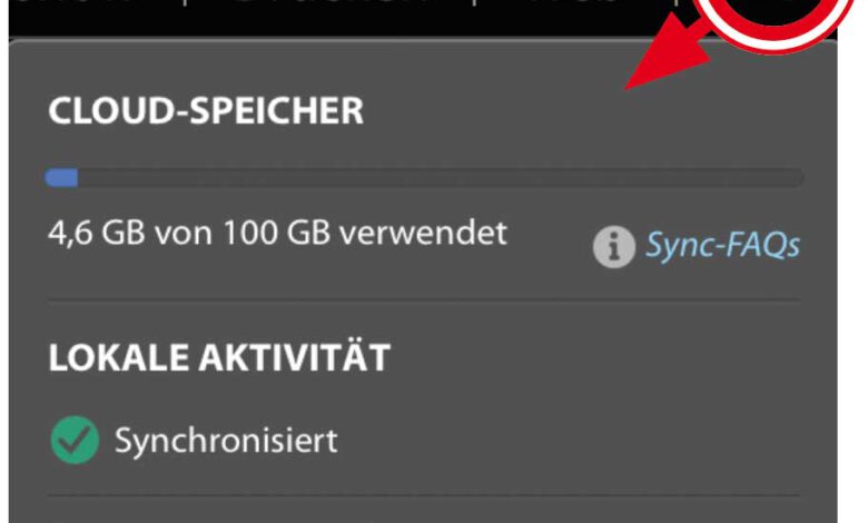 In Lightroom Classic wird seit dem juni-Update 2020 der Status der Cloud-Synchronisation wie in Lightroom über ein eigenes Icon in der rechten oberen Programmecke angezeigt. Klicken Sie auf das Icon, um detailliertere Informationen über Ihr Speicherkontingent zu erhalten oder um die Synchronisierung zu pausieren. Über das Zahnrad-Symbol unten rechts springenMehr