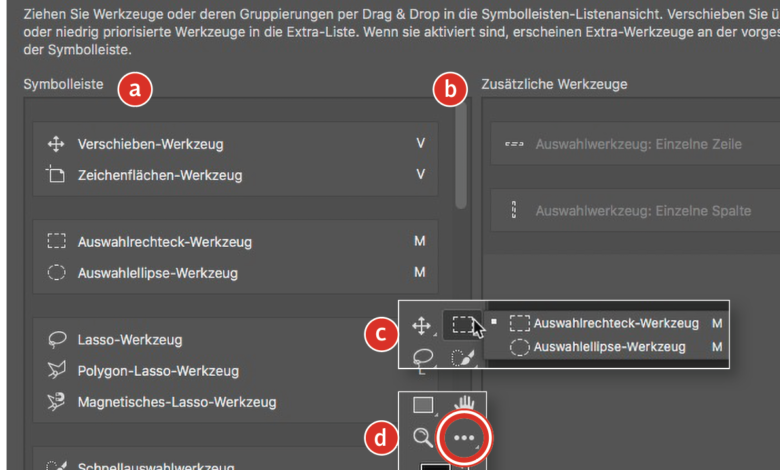 Über »Bearbeiten > Symbolleiste« blenden Sie Werkzeuge in Photoshops Symbolleiste aus, die Sie nie oder nur selten benötigen. Das funktioniert, wenn man den Dialog verstanden hat, ziemlich intuitiv: Im linken Bereich (a) sehen Sie die in der Symbolleiste angezeigten Werkzeuge. Werkzeuge, die Sie ausblenden möchten, klicken Sie an und ziehenMehr