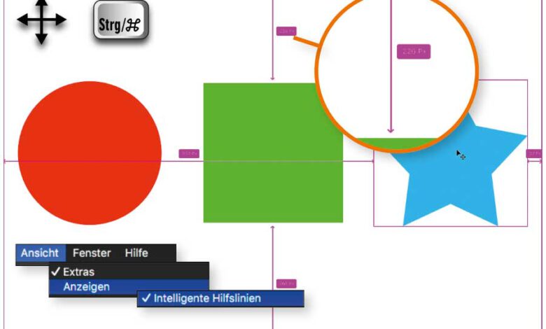 Dank der »Intelligenten Hilfslinien« können Sie beim Ausrichten von Objekten auf das Erzeugen von Hilfslinien oft verzichten. Aktivieren Sie die Funktion über »Ansicht > Anzeigen > Intelligente Hilfslinien«. Wenn Sie nun Objekte auf unterschiedlichen Ebenen mit dem »Verschieben-Werkzeug« bewegen, werden automatisch violette Hilfslinien eingeblendet, sobald die Kanten oder die MittenMehr