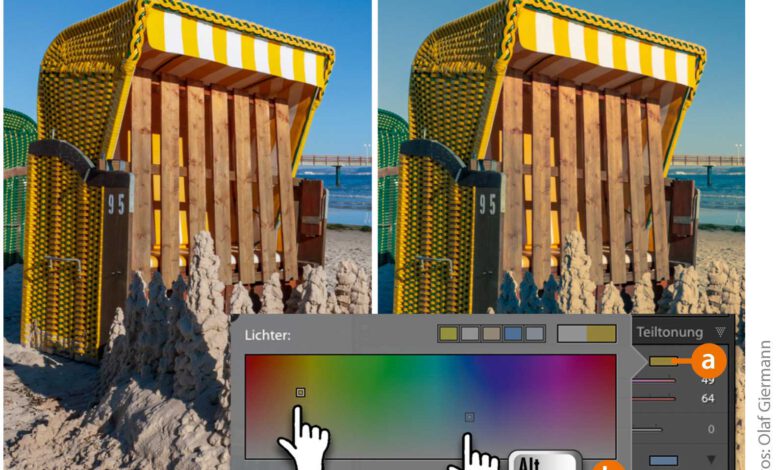 Mit der »Teiltonung« können Sie auf einfache Weise Fotos mit einer unterschiedlichen Farbgebung in den Tiefen und Lichtern versehen. In Lightroom geht das nicht nur über Schieberegler, sondern deutlich komfortabler über den Farbwähler, den Sie mit einem Klick auf das Farbfeld hinter »Lichter« (a) öffnen. In horizontaler Richtung wählen SieMehr