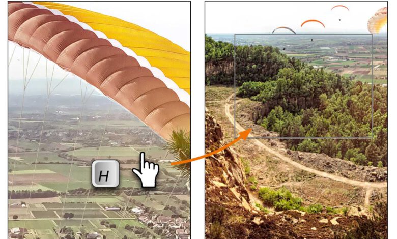 Die Funktion „Vogelperspektive“ (english: birds-eye-view) erlaubt bei weit hineingezoomter Anzeige, vorübergehend das gesamte Bild im Fenster einzupassen und dann an eine andere Bildstelle zu springen. Der resultierende neue Bildausschnitt wird durch einen grauen Rahmen visualisiert. Die Funktion ist auch sehr praktisch, um kurz zu überprüfen, wo man sich denn geradeMehr