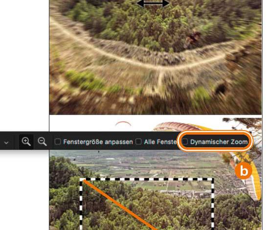 Wie sich das »Zoom-Werkzeug« in Photoshop verhält, hängt davon ab, ob Sie in der Werkzeugleiste ein Häkchen bei »Dynamischer Zoom« gesetzt haben. Klicken Sie bei aktiviertem dynamischen Zoom in das Bild und ziehen Sie den Mauszeiger nach rechts, zoomen Sie in das Bild hinein, ziehen Sie nach links, zoomen SieMehr