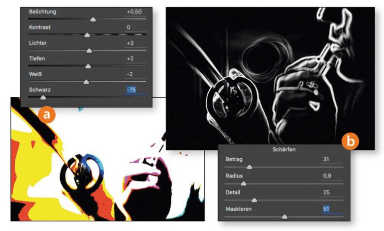 Durch Drücken der »Alt«-Taste beim Bewegen von Schiebereglern in Camera Raw erhalten Sie so manche hilfreiche Vorschau. So sehen Sie beim Ändern von »Belichtung«, »Lichter«, »Tiefen«, »Weiß« und »Schwarz« direkt im Bild, wo Tonwerte beschnitten werden (a). Die »Schärfen«-Regler im Tab »Details« zeigen eine Vorschau des Schärfungsradius beziehungsweise der KantenmaskeMehr