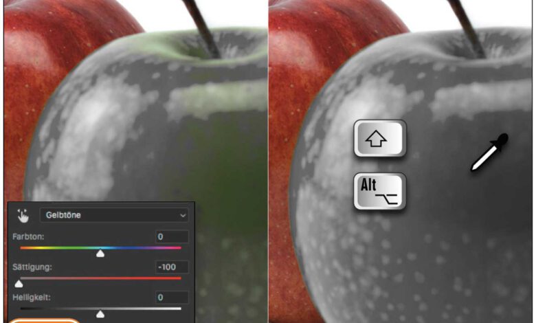 Ausgewählte Farbbereiche lassen sich mit Hilfe der Pipetten des Dialogs »Farbton/Sättigung« optimieren. Für das Hinzufügen von Farben wählen Sie die Pipette mit dem Plus-Symbol, für das Abziehen dagegen jene mit dem Minus-Symbol. Auf diese Weise können Sie Farbbereiche auch ohne vorherige Auswahl präzise umfärben. TIPP: Statt ständig die Pipetten zuMehr
