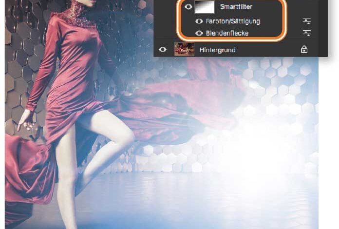 Blendenflecke-Effekte sind so modern wie nie zuvor. Photoshops »Blendenflecke«- Filter ist dagegen in die Jahre gekommen. Nützlich ist er trotz seiner wenigen Möglichkeiten, wenn Sie selbst variieren und kombinieren. Erzeugen Sie eine mit Schwarz gefüllte Ebene, wandeln Sie diese in ein Smartobjekt um, ändern Sie die Füllmethode in »Negativ multiplizieren«Mehr