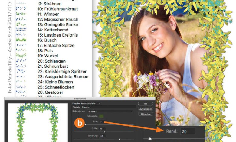 In Photoshop CC finden Sie unter den Renderfiltern auch den Filter »Bilderrahmen«, der 47 verschiedene, teilweise witzig benannte Rahmeneffekte (a) bietet, die Sie über mehrere Parameter abstimmen können. Erzeugen Sie eine neue, leere Ebene für den Rahmen und rufen Sie den Renderfilter »Bilderrahmen« auf. Die Kombinationsmöglichkeiten der einzelnen Parameter undMehr