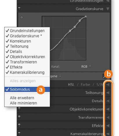 Was in Lightroom CC als »Einzelbedienfeldmodus« benannt ist, heißt im klassischen Lightroom »Solomodus«. Auch hier sorgt diese Funktion für Platzersparnis und Übersicht, denn sie öffnet nur die aktivierte Palette und schließt alle anderen. Wählen Sie nach einem Rechtsklick auf einen Palettenkopf »Solomodus« (a) oder klicken Sie mit der linken MaustasteMehr