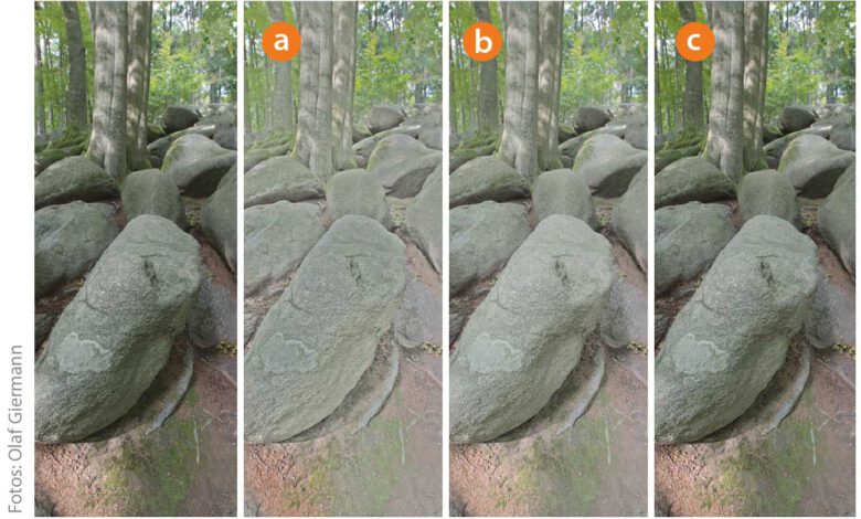Vor allem die beiden Parameter »Radius« und »Ton« machen den »Tiefen/Lichter«-Dialog immer noch gegenüber den gleichnamigen Reglern in den aktuellen Versionen von Camera Raw beziehungsweise Lightroom interessant. Mit »Radius« optimieren Sie die Plastizität der abgebildeten Objekte. Sehr kleine Werte lassen das Bild nach der Korrektur flach erscheinen (a). Zu hoheMehr