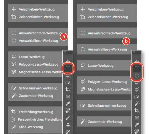 Wenn Sie häufig per Klick zwischen gruppierten Werkzeugen wechseln, kann die dafür notwendige, kleine Verzögerung auf Dauer schon stören. Das lässt sich zum Glück ändern. Beispielsweise sind standardmäßig das »Auswahlrechteck« und die »Auswahlellipse« gruppiert. Das erkennen Sie im Dialog »Symbolleiste anpassen« an der hellgrauen Fläche (hier aufgehellt), die sich beideMehr