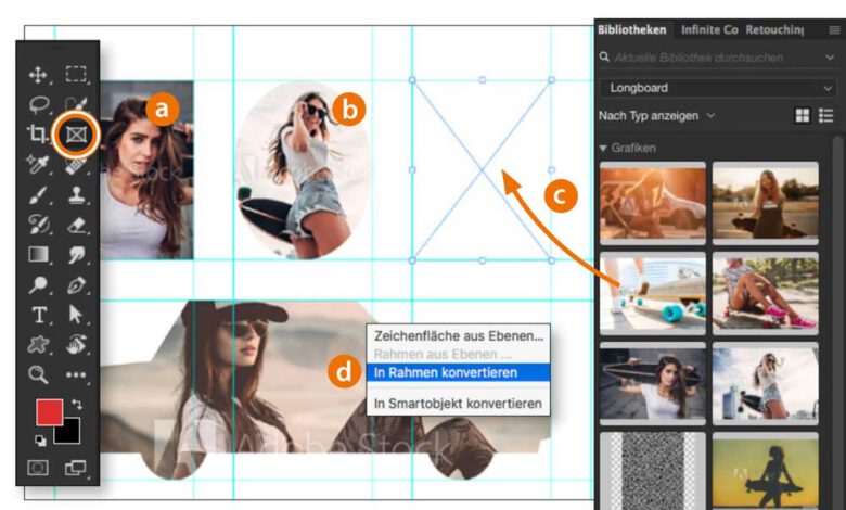 Layoutende Anwender werden sich über das aus InDesign bekannte Rahmen Werkzeug freuen, das nun auch in Photoshop CC 2019 enthalten ist. Damit ziehen Sie rechteckige (a) oder elliptische (b) Platzhalter-Rahmen im Bild auf, die Sie per Drag & Drop (c) mit Bildern füllen. Das funktioniert aus dem Explorer/Finder und ausMehr