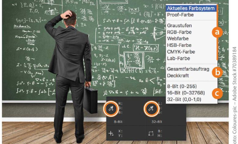 Das Farbsystem für die Anzeige der Farbwerte können Sie in den »Infobedienfeldoptionen« festlegen. Schneller geht es direkt über die Pipettensymbole in der »Info«-Palette. Klicken Sie auf die jeweilige Pipette, dann öffnet sich ein Menü, in dem Sie sowohl den gewünschten Farbmodus (a), den »Gesamtfarbauftrag« für die Druckvorstufe (b) als auchMehr