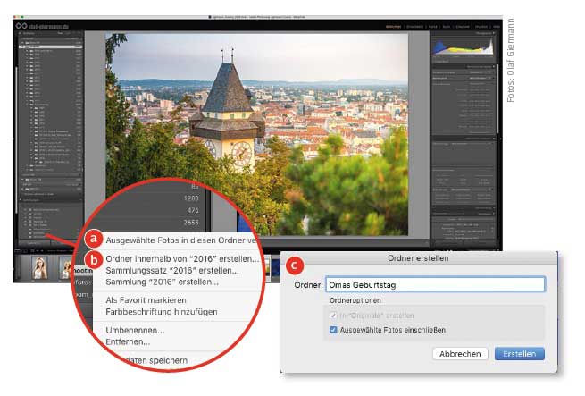 Lightroom erlaubt durch einige interessante Funktionen das schnelle Organisieren eines importierten Bildbestandes. Falls Sie Ordnung in ein bestehendes Chaos bringen wollen, sollten Sie das daher am besten direkt in Lightroom erledigen. Importieren Sie zunächst die bislang unsortierte Fotosammlung in einen gemeinsamen Ordner. Dort wählen Sie die Bilder aus, die SieMehr