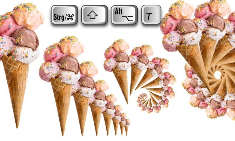 Wenn Sie über »Bearbeiten > Frei transformieren« ein Objekt skaliert/gedreht/verschoben haben, können Sie diese Transformation über »Bearbeiten > Transformieren > Erneut« (Shortcut: »Strg/Cmd-Shift-T«) wiederholen. Mit gehaltener »Alt«-Taste erzeugen Sie dabei Kopien der Ebene. Duplizieren Sie die Objekt-Ebene zunächst (»Strg/Cmd-J«), transformieren Sie sie wie gewünscht und wiederholen Sie anschließend dieselbe TransformationMehr