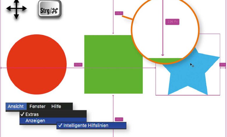 Dank der »Intelligenten Hilfslinien« können Sie beim Ausrichten von Objekten auf das Erzeugen von Hilfslinien oft verzichten. Aktivieren Sie die Funktion über »Ansicht > Anzeigen > Intelligente Hilfslinien«. Wenn Sie nun Objekte auf unterschiedlichen Ebenen mit dem »Verschieben-Werkzeug« bewegen, werden automatisch violette Hilfslinien eingeblendet, sobald die Kanten oder die MittenMehr