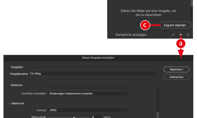 Immer wieder benötigte Format- und Größenänderungen führen Sie am einfachsten über das »Exportieren«-Fenster durch. Hier erzeugen Sie für den jeweiligen Anwendungszweck eine Vorgabe, in der Sie den Speicherort, das Bildformat, die Bildgröße und die enthaltenen Metadaten definieren (a). Die verschiedenen Presets erscheinen dann als Liste im »Exportieren«-Fenster. Bilder, die gemäßMehr