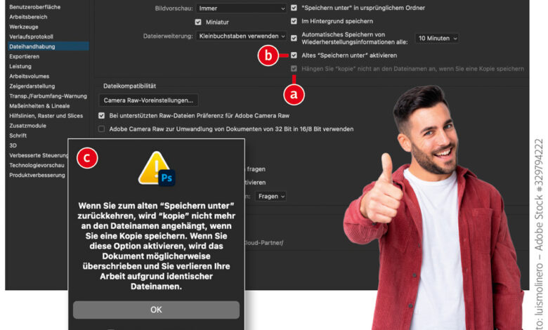 Seit Version 22.4.2 hat Photoshop zwei neue Speichern-Optionen. Unter »Voreinstellungen > Dateihandhabung« lässt sich das eher nervende als hilfreiche Anhängen von „Kopie“ an den Dateinamen verhindern, wenn Sie eine Bildkopie speichern (a). Die Option wird zwangsläufig aktiviert, wenn Sie »Altes „Speichern unter“ aktivieren« (b) einschalten. Durch diese Option müssen SieMehr