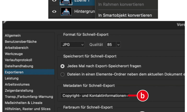 Per Rechtsklick auf eine Ebene und denBefehl »Schnellexport als …« (a) lassen sich ausgewählte Ebenen schnell als Dateien speichern. In den Voreinstellungen unter »Exportieren« können Sie das Format, den Speicherort und die enthaltenen Metadaten festlegen. Leider beschränken sich die Metadaten-Optionen (b) auf »Copyright- und Kontaktinformationen« und »Ohne«. Die automatische UmwandlungMehr