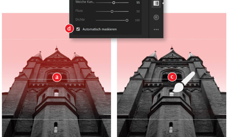 Bereiche von Verlaufsmasken lassen sich problemlos demaskieren. Ziehen Sie wie unten gezeigt einen Verlauf mit dem Werkzeug »Linearer Verlauf« ins Bild (a). Die dargestellte Fassade können Sie nun manuell wieder aus der Maske löschen, indem Sie den »Linearen Verlaufsradiergummi« (b) auswählen und die Fassade (c) übermalen. Der Maskierungsverlauf verschwindet anMehr