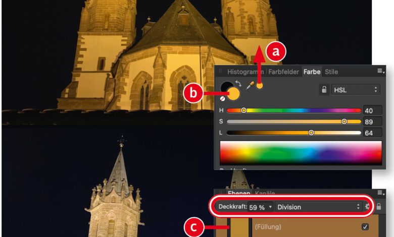 Der Ebenenmodus »Division« lässt sich vor allem für das schnelle Beseitigen oder Reduzieren eines Farbstichs einsetzen. Ziehen Sie den kleinen Farbkreis (a) neben dem Pipetten-Symbol aus der »Farbe«-Palette ins Bild an eine ursprünglich farblich neutrale Stelle, die von dem Licht beschienen wird, das den Farbstich verursacht. Lassen Sie jetzt dieMehr