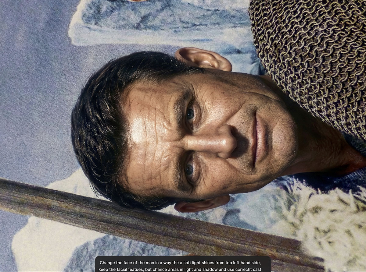 Fazit also: Manche KI ist durchaus dazu in der Lage, einen solchen Prompt umzusetzen, tut das in der Praxis aber nur ausnahmsweise. Seedream etwa folgte brav der Anforderung der Beleuchtungsveränderung, ignorierte aber die Prompt-Bestandteile, die verlangten, Ausrichtung und Gesichtszüge unverändert zu belassen. Man wird also noch eine Weile warten müssen, bis die Modelle in der Lage sind, mehr 3D-Informationen zu berücksichtigen.
