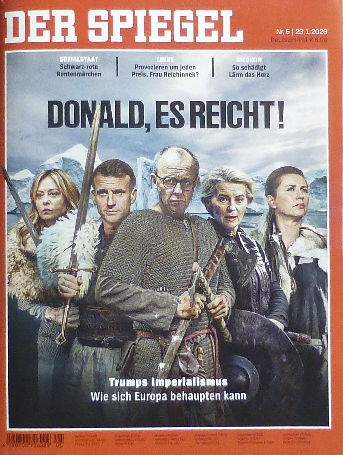 Die Ausgabe des „Spiegel“ zeigt in dieser Woche fünf europäische Politikerinnen und Politiker, die in mittelalterlicher Gewandung Grönland gegen einen drohenden Angreifer verteidigen wollen. Schöne Idee. Schlimm nur, dass die für die Montage Verantwortlichen noch immer nicht gelernt haben, dass bei einer solchen Zusammenstellung einheitliche Beleuchtungsbedingungen herrschen müssen.