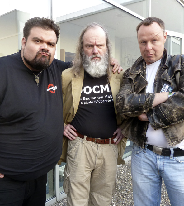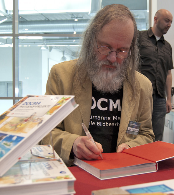 Mehr als tausend Mitglieder waren gekommen, um sich auszutauschen, von Profis zu lernen – und natürlich, um zu feiern. Es gab Vorträge, Workshops und Shootings, am Samstagabend auch Party und Musik. Zuvor hatte fotocommunity-Gründer Andreas Meyer am Beispiel der Webseitenentwicklung die Geschichte der Community aufgeblättert, der neue Geschäftsführer Dr. Flasbarth vergab die Preise an die besten Fotografen aus fünf Kategorien. Bei den Referenten unter anderem mit dabei: DOCMA-Herausgeber Doc Baumann, oben links mit seinen Kollegen André Hünseler und Uli Staiger; rechts signiert er am Addison-Wesley-Stand das neue DOCMA-Buch.