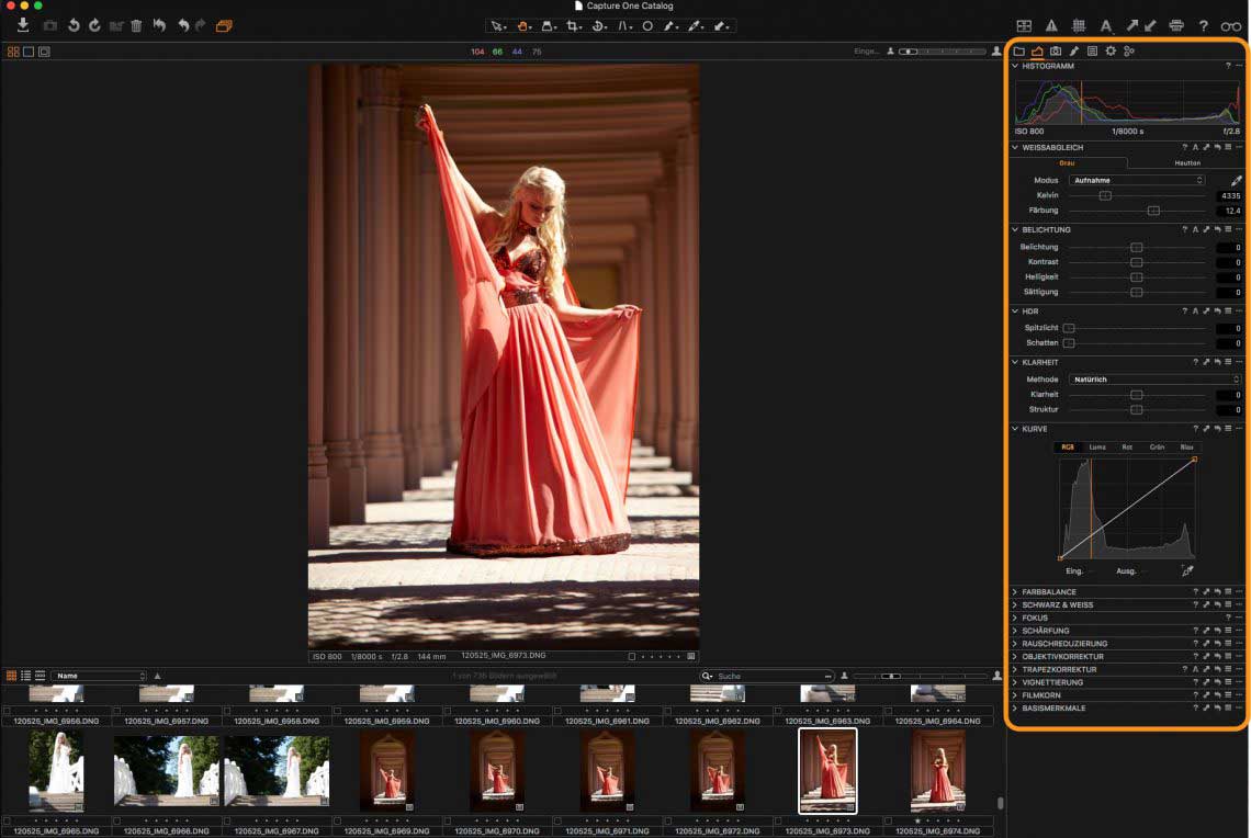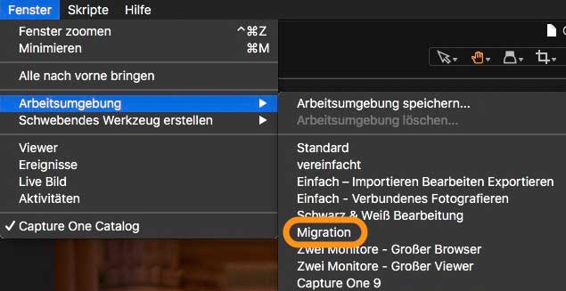 Passen Sie die Oberfläche doch einfach an die von Lightroom an! Das klingt komplizierter als es ist, denn tatsächlich müssen Sie mit nur einem Klick den Arbeitsbereich „Migration“ im Fenster-Menü aktivieren und schon sehen Sie die Bearbeitungsfunktionen wie in Lightroom auf der rechten Seite – und anders als im Capture One-Standardarbeitsbereich mit tatsächlich allen Funktionen. Wie schön.