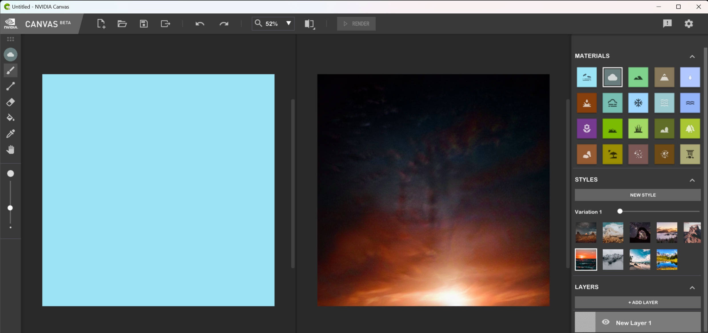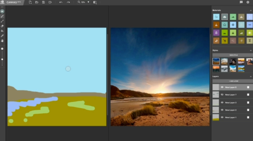 Nvidia Canvas Version 1.4 befindet sich immer noch in der Beta-Phase, funktioniert aber schon zuverlässig. Hier können Sie sich eine Video-Demo anschauen und die App herunterladen. Die App-Oberfläche ist selbsterklärend: Links im Bild skizzieren Sie Elemente mit einfachen Pinselstrichen, rechts davon sehen Sie das Ergebnis. In der rechten Spalte wählen Sie unter »Materials«, was Sie einfügen möchten (Berge, Wasser, Wolken, Sand, Felsen …) und unter »Styles« wählen Sie aus verschiedenen Szenen-Vorgaben.