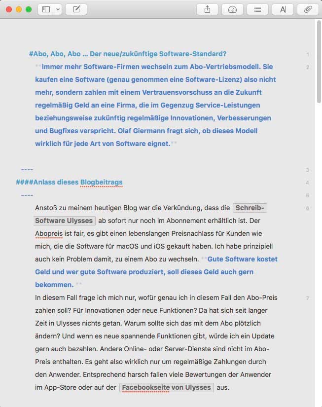 Anstoß zu meinem heutigen Blog war die Verkündung, dass die Schreib-Software Ulysses ab sofort nur noch im Abonnement erhältlich ist. Der Abopreis ist fair, es gibt einen lebenslangen Preisnachlass für Kunden wie mich, die die Software für macOS und iOS gekauft haben. Ich habe prinzipiell auch kein Problem damit, zu einem Abo zu wechseln. Gute Software kostet Geld und wer gute Software produziert, soll dieses Geld auch gern bekommen.