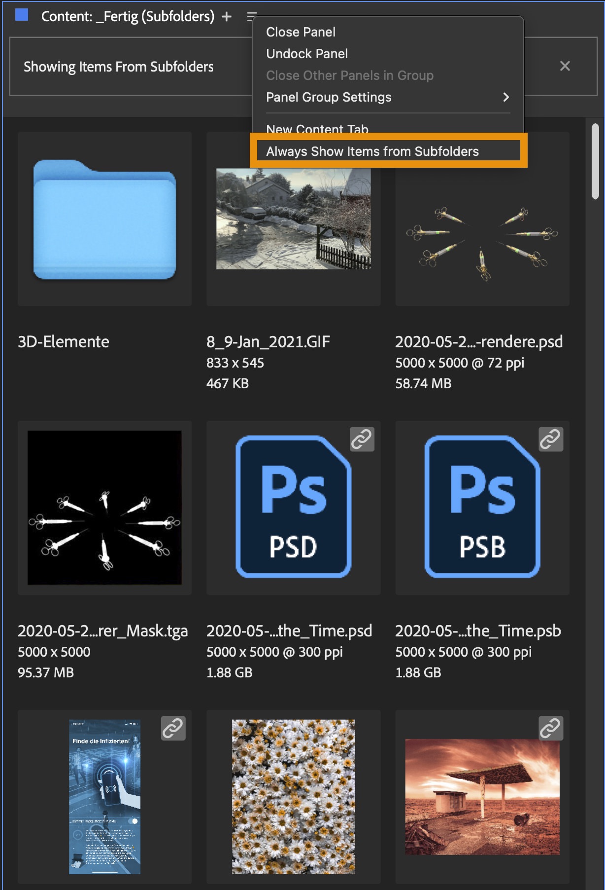 Bridge kann sich jetzt merken, wenn Sie immer alle Unterordner eines Ordners und deren Inhalte anzeigen lassen möchten. Dafür aktivieren Sie die rekursive Anzeige und wählen dann aus dem Panel-Hamburgermenü die Option »Always show items from subfolders«.