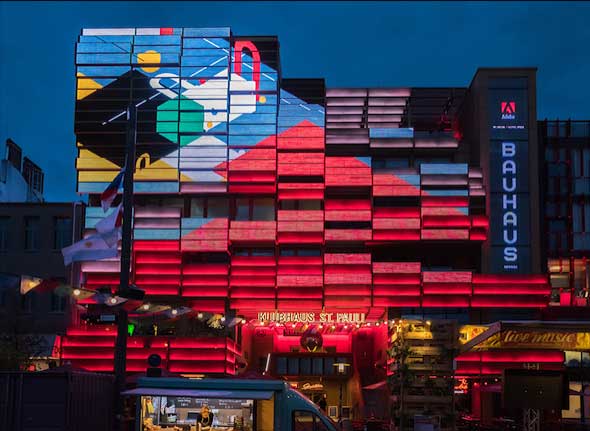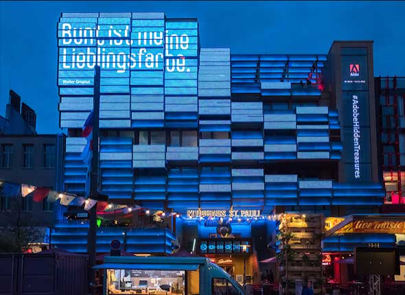 Wo der angekündigte Adobe-Event stattfinden würde, war schon von Weitem zu sehen, denn auf der programmierbaren Medienfassade des Klubhaus St. Pauli am Spielbudenplatz erschienen animierte Clips des Designers und Illustrators Sebastian Onufszak. Diese standen im Zusammenhang mit dem neuesten #AdobeHiddenTreasures-Projekt, alte, im Bauhaus Dessau entworfene Schriften zu neuem, digitalem Leben zu erwecken.