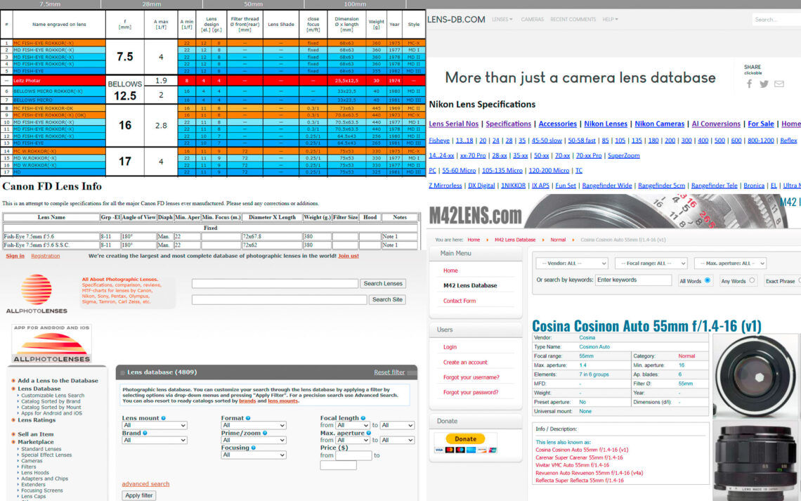 Nach alten Objektiven muss man suchen. Oft stellt sich die Frage, ob der Fund wirklich dem Gesuchten entspricht. Bei bekannten Marken ist das, je nach Hersteller, relativ einfach. M42-Objektive von OEM-Produzenten bieten dagegen verwirrende Vielfalt, Exaktar hat beispielsweise nichts mit der Traditionsmarke Exakta gemeinsam. Welche Altglas-Datenbanken können bei Suche und Verifizierung unterstützen?