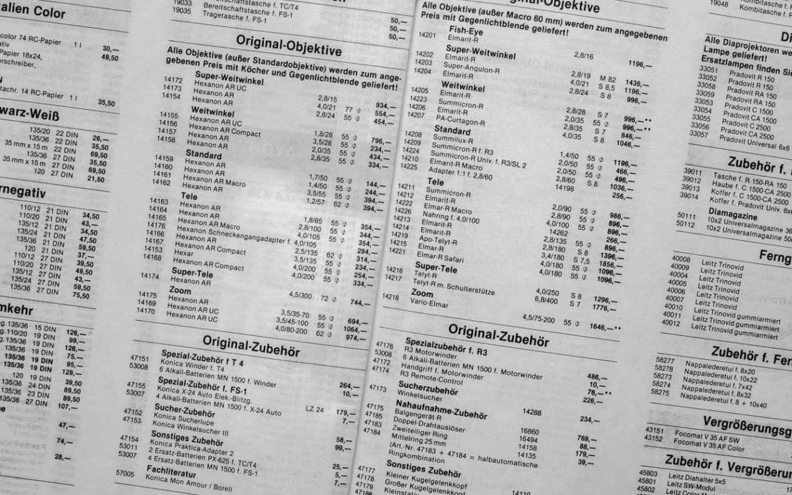 Heute hüte ich das alte „Kursblatt“ und die nüchterne Betrachtung vermittelt interessante Eindrücke. Ein Olympus OM 21/3.5 ist für 540 D-Mark gelistet, der „Second Hand Guide“ nennt aktuell 270 Euro. Das 28/3.5, ebenfalls von Olympus, kostete einst 300 D-Mark und ist inzwischen für um die 30 Euro zu haben. Mit der begehrten Vivitar Serie 1 gestalten sich die Relationen ähnlich. Ein Blick aufs Leica-Angebot: Kamera R3 mit Summicron 50/2 für satte 2000 D-Mark. Die Kamera heute – monetär kaum noch der Rede wert. Das Objektiv, je nach Baujahr und Zustand, zwischen 200 und 300 Euro. Ein letzter Blick auf weitere Leica R-Optiken offenbart nur zwei unter 500, viele knapp unter 1000 und eine erstaunlich große Menge etwas darüber oder knapp unter 2000 D-Mark. Auch wenn diese Altglas-Sorte heute zu den hochpreisigen zählt, ist sie – von exotischen und lichtstarken Ausnahmen abgesehen – für weit mehr Käufer erschwinglich als damals. Interessant ist auch eine im Digicamclub einsehbare Liste mit Preisen von 2008.
