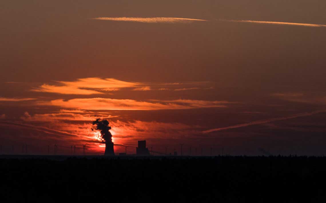 Endlich angekommen ist noch ein 30 Meter hoher Stahlturm zu erklimmen. Die Perspektive von der Dachterrasse überzeugt nicht, wieder runter. Eine Aussichtsplattform in der Mitte bietet den optimalen Blick auf den Industriepark Schwarze Pumpe, mit der jetzt hinter dem Horizont aufsteigenden Sonne.